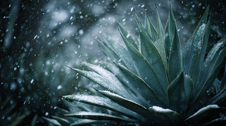 First snow falling gently on Blue agave, a few snowflakes drifting slowly and settling on the leaves; fresh air.