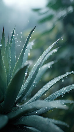 Soft rain falling gently on Agave, with water droplets forming and slowly dripping. The background is softly blurred with natural, moody atmosphere.