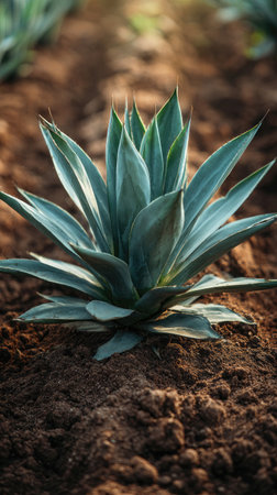 Blue agave with small fresh leaves, growing upright in fertile soil, sunlight filtering gently, realistic textures, vibrant green tones, natural photography style, wide balanced composition