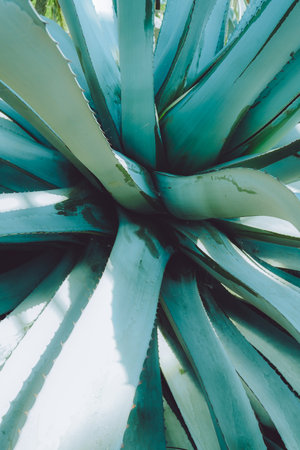 Prickly leaves of blue agave cactus close-up. Ingredient for the production of tequila.