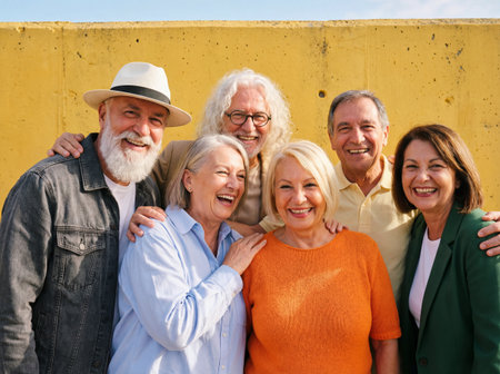 A diverse group of six cheerful elderly men and women stands close together while hugging and laughing in front of a textured yellow concrete wall on a sunny day.