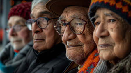 Four elderly people sitting side by side, wearing winter hats glasses portrait image, ai generated. Faces etched with lines of age picture photorealistic. Senior citizens concept photo realistic