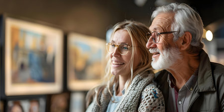 Engaging Conversation: Elderly Couple Admiring Artwork in Museum. Concept Art Appreciation, Senior Activity, Museum Visit, Life Enrichment, Cultural Exploration
