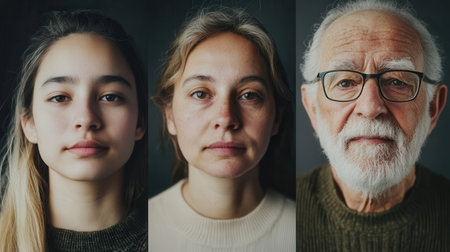 Three individuals of varying ages share the frame, each displaying unique expressions. The contrast between youth, middle age, and elder wisdom is evident.