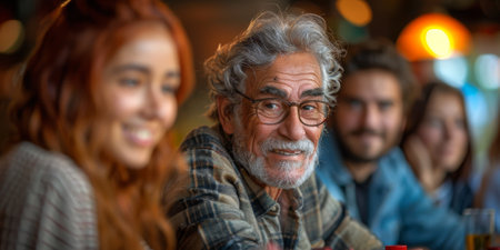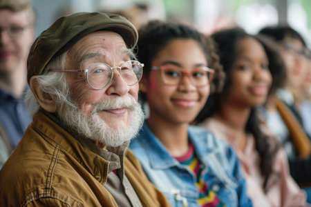 Diverse Group of People Smiling at an Event with Elderly Man in Foreground.
