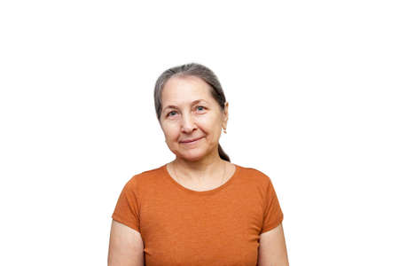 Charming Gray-Haired Woman in brown t-shirt Smiles. Portrait
