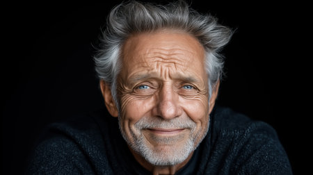 An elderly man with gray, tousled hair shows a joyful smile. His blue eyes reflect warmth and kindness, and deep wrinkles on his face tell a story of a life lived fully.