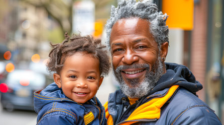 African American man joyfully holds a smiling child outdoors, surrounded by an urban environment, showing a warm family moment.