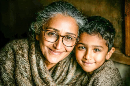. Elderly woman and young boy are sharing a warm embrace in a cozy indoor setting, showcasing love and connection between generations