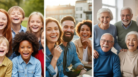 Three panels present diverse groups of individuals smiling broadly. The images showcase a range of ages and ethnic backgrounds. The composition is well-lit, suggesting an outdoor setting with potential commercial and editorial applications, suitable for illustrating themes of community and relationships.
