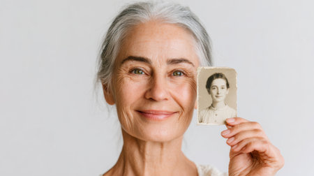 A senior white woman holds up a vintage photo of herself when she was younger, reminiscing about cherished memories and the passage of time. AI Generative AI