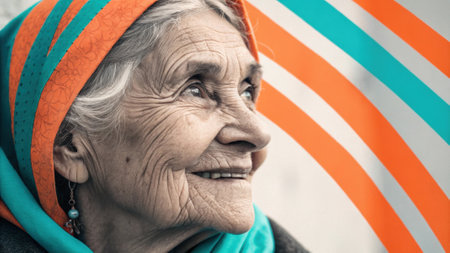 An artistic portrait showcasing an elderly woman whose gentle smile is adorned with bold neon stripes of orange and teal that ripple across her features creating a beautiful.