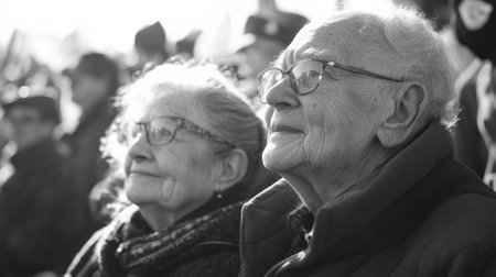 Elderly couple attending political rally showing hope and concern
