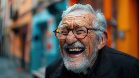 An elderly man with glasses laughing contagiously on a colorful urban street, radiating warmth and happiness. World Laughter Day