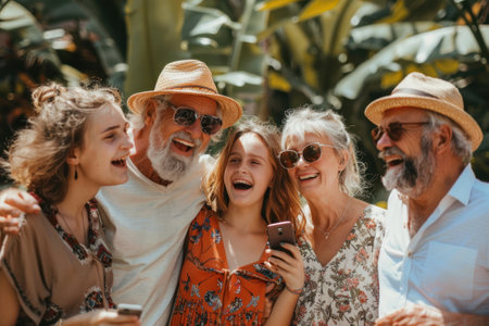 large family, different ages standing together side by side, laughing, taking shared selfies on their phones, a friendly family on a summer day in nature.