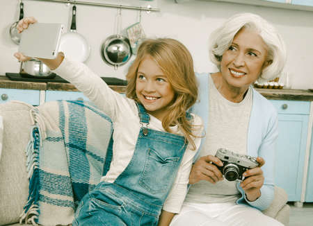 Granddaughter Making Selfie Or Video With Her Beautiful Grey Haired Grandmother While Sitting On White Sofa Or Couch At Home, On Kitchen Background Happy Ladies Smiling For Camera
