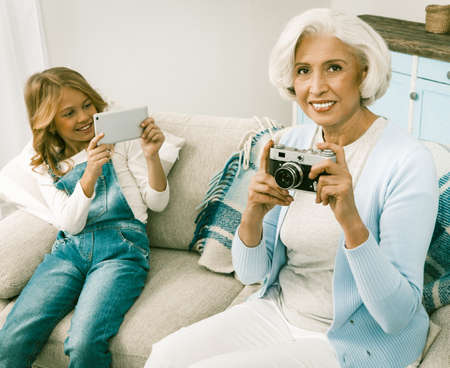 Granddaughter Taking Photos Or Videos On Her Seasonal Gift For White Haired Italian Grandmother Upgrading Her With New Smartphone, While Grandmother Taking Photos On Film Camera