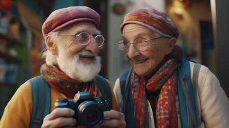 Happy elderly couple, tourists in berets, standing on the street, holding a camera in their hands