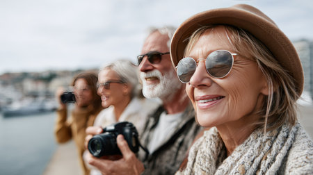 A vibrant group of seniors enjoys a day by the seaside, capturing memories with their cameras. Their joyful expressions showcase the beauty of friendship and shared experiences in nature.