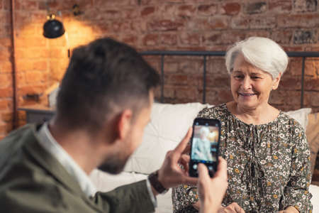 grinning content elderly pensioner mother posing for a photo taken by her middle-aged son Mothers Day. High quality photo