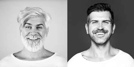 portrait of same young and old man smiling, AI generated image