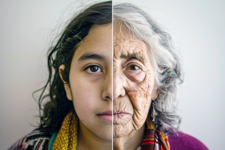 Split screen comparison of elderly and young Hispanic woman, portrait concept, AI generated