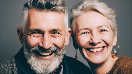 Portrait of happy mature married couple, modern man woman laughing and looking at camera