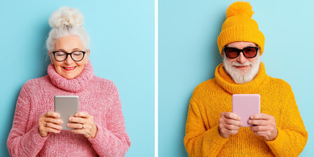 Seniors looking at smartphones while smiling, wearing cozy colorful sweaters. Bright teal and orange background creates a cheerful atmosphere. Concept of technology, lifestyle, senior engagement.