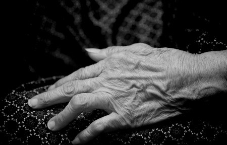 Asian old woman 's hand closeup black and white dramatic tone