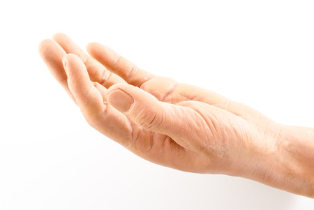 Close up of single human hand isolated on white trying to help the imagery.