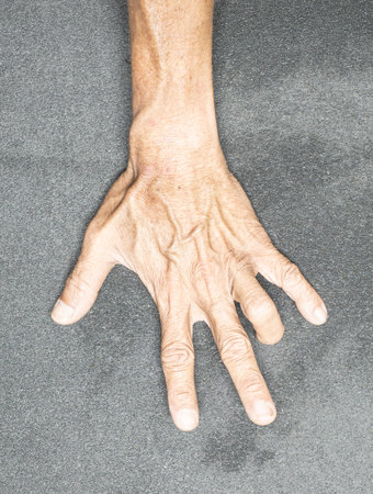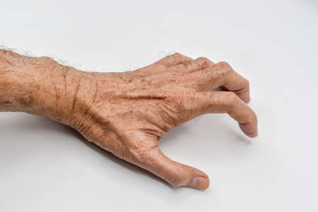 Hand muscle rigidity and finger flexion of Asian elder man.