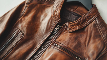 Close-up view of a sophisticated brown leather jacket hanging, showcasing its smooth texture and functional pockets, ideal for fashion lovers seeking style and comfort.
