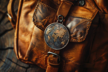 Close-up of brown leather backpack with world map emblem on badge. Concept of travel, adventure and world exploration