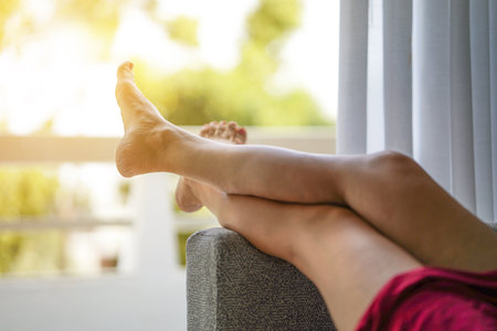 A close-up shot of legs resting on a white background, suggesting a sense of comfort or relaxation.