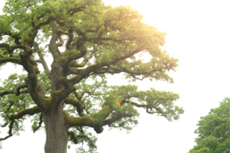 A large, ancient oak tree dominates the frame, its thick, moss-covered branches reaching outwards. Sunlight filters through the green leaves, creating a warm, ethereal glow against the bright sky.
