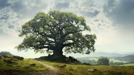A solitary, ancient oak tree stands proudly on a grassy hillside, overlooking a serene landscape.