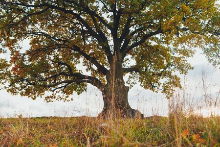 Serene Old Hollow Oak Tree in Autumn Park Landscape