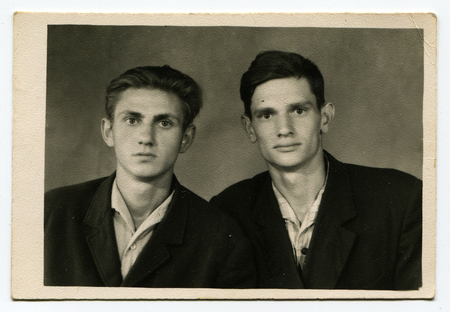 USSR - CIRCA 1950s: An antique photo shows black and white portrait of two young men.