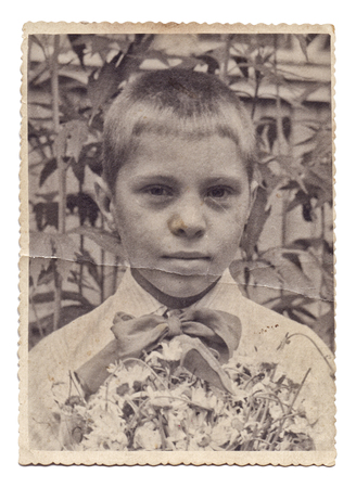 A vintage, half-turned portrait of an eight-year-old boy. Retro photo, 1966