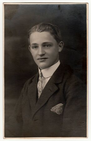 LIBEREC (REICHENBERG), THE CZECHOSLOVAK REPUBLIC - CIRCA 1920s: Vintage photo shows young man wears jacket with handkerchief in the pocket. Antique black & white studio portrait.