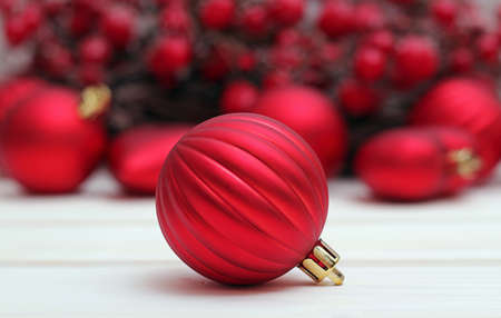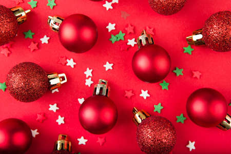 Christmas background with decorations. Christmas greeting postcard with xmas red balls. Copy space.