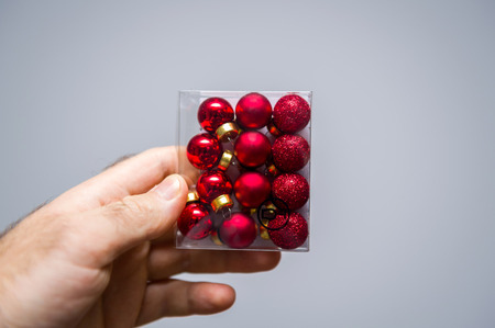 Man holding against white background plastic box with tiny small christmas red glass bowl decorations