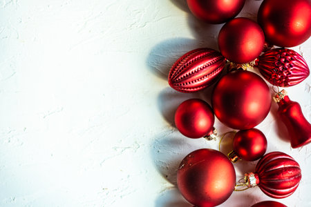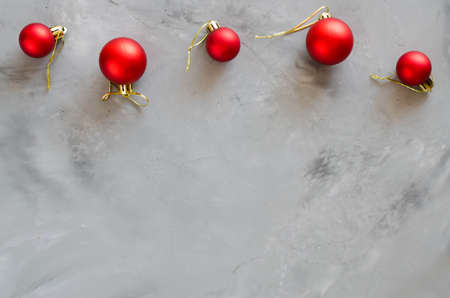 Christmas card concept with variety of holiday festive red balls on concrete background