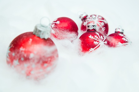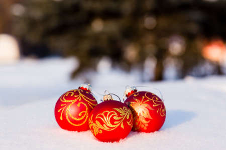 Three red christmas balls on a snow. New Year greeting card concept. Copy-space
