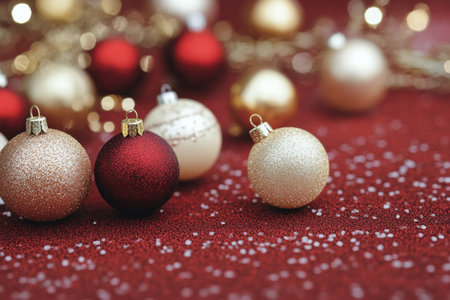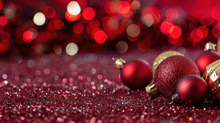 Beautiful arrangement of red and gold Christmas ornaments on a sparkling surface, enhanced by soft bokeh lights in the background, perfect for holiday spirit.