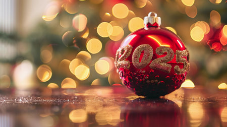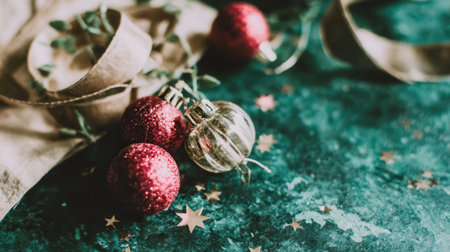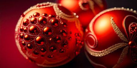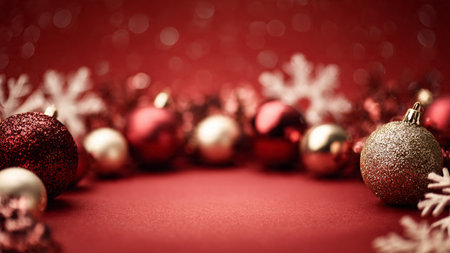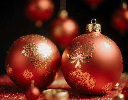 Beautifully designed red Christmas ornaments with golden patterns adorn a sparkling table, creating a festive atmosphere for the holiday celebration and New Year countdown.