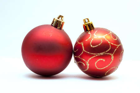 Close-up of various red Christmas ornaments on a two-tone background, with shadows.