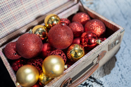 Christmas toys in an open old suitcase. Christmas background, Christmas card, Christmas wallpaper.