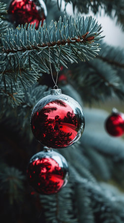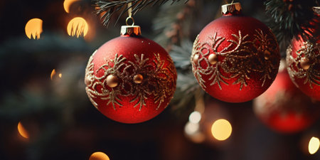 Beautifully decorated Christmas ornaments red and gold hang from lush evergreen tree, creating festive and warm atmosphere. intricate designs and shimmering textures evoke sense of holiday cheer