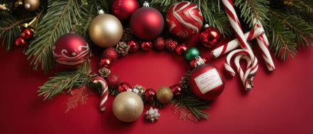 AI Generated. Christmas or Happy New Year composition made of fir tree branches, candy and red holiday decorations